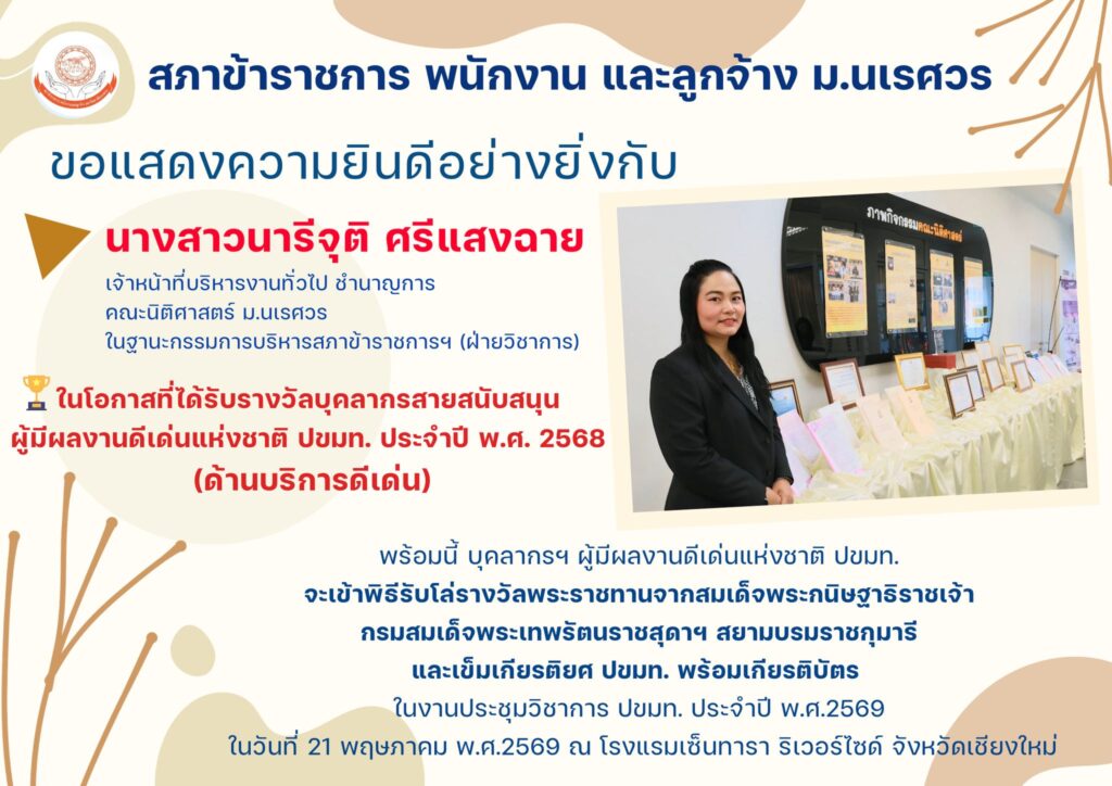 สภาข้าราชการ พนักงาน และลูกจ้าง ม.นเรศวร ขอแสดงความยินดีอย่างยิ่งกับ นางสาวนารีจุติ ศรีแสงฉาย เจ้าหน้าที่บริหารงานทั่วไป ชำนาญการ คณะนิติศาสตร์ ในฐานะคณะกรรมการสภาข้าราชการ พนักงาน และลูกจ้าง ม.นเรศวร (ฝ่ายวิชาการ) ในโอกาสที่ได้รับรางวัลบุคลากรสายสนับสนุนผู้มีผลงานดีเด่นแห่งชาติ ปขมท. ประจำปี พ.ศ.2568 (ด้านบริการดีเด่น)
